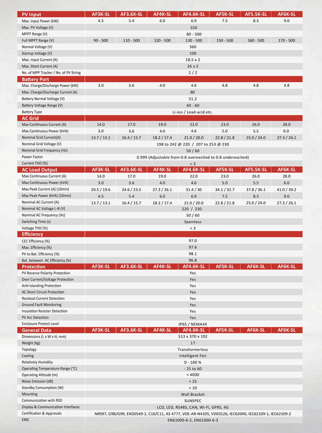 | Hybride omvormer Enkelfasig | AF3K-SL 3KW | AF5K-SL 5KW | AF6K-SL 6KW |