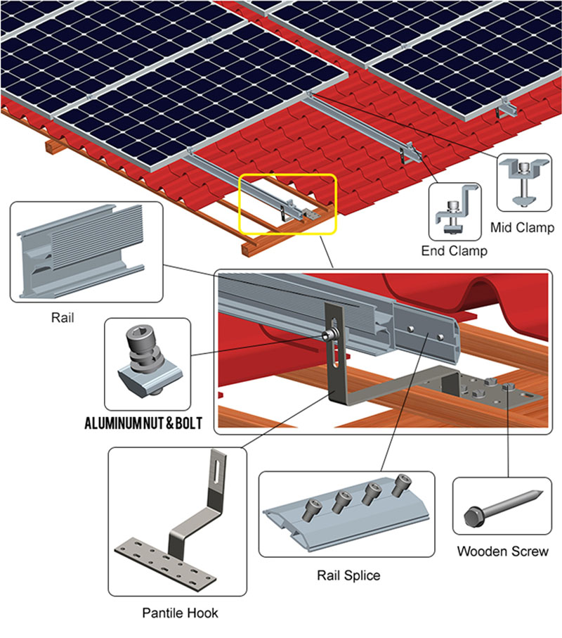 1. Veilige bevestiging: het zonne-montagesysteem met pannendakhaken biedt een veilig en betrouwbaar bevestigingspunt voor zonnepanelen op pannendaken, waardoor beweging of losraken bij harde wind of zware weersomstandigheden wordt voorkomen.
